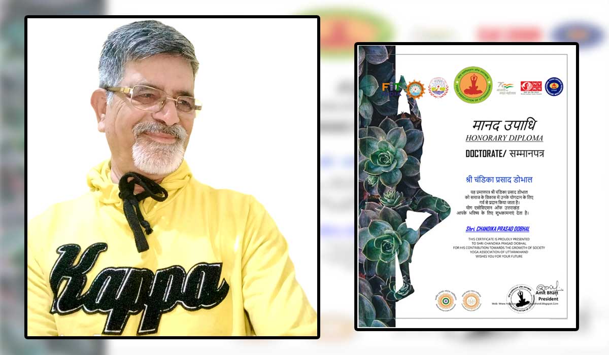 ऐसी प्रतिभा को उत्तराखंड योगा एसोसिएशन के अध्यक्ष अमित भट्ट द्वारा गत दिवस मानद उपाधि प्रदान कर गोरवान्वित किया गया। वन विभाग में निरंतर 36 साल सर्वेयर के पद पर सेवा देने वाले देहरादून वन प्रभाग से सेवा निवृत हुए चंडिका प्रसाद डोभाल को उनके सामाजिक कार्यों के लिए व स्वस्थ बनाए रखने के लिए योग को आगे बढ़ाने में योगदान के लिए उत्तराखंड योग एसोशिएशन ने मानद उपाधि देकर सम्मानित किया।